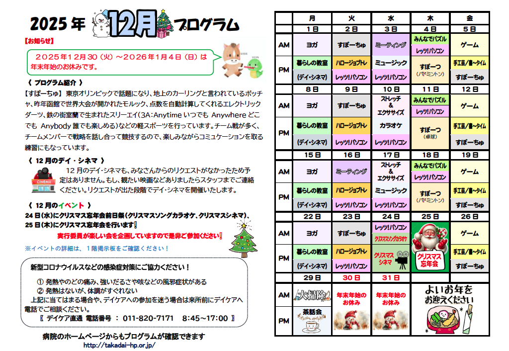 精神科デイケアとは、精神障害のある方が、社会参加、社会復帰、復学、就労などを目的に様々なグループ活動を行う通所施設です。
